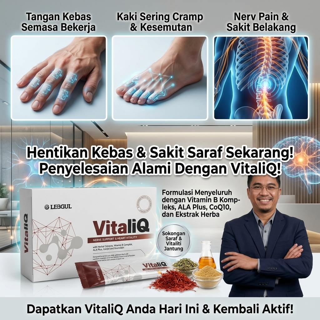 VitaliQ mencuci laluan salur darah yang tersumbat, kemudian menyalurkan nutrisi Vitamin B Complex untuk baiki fungsi sel saraf yang rosak.